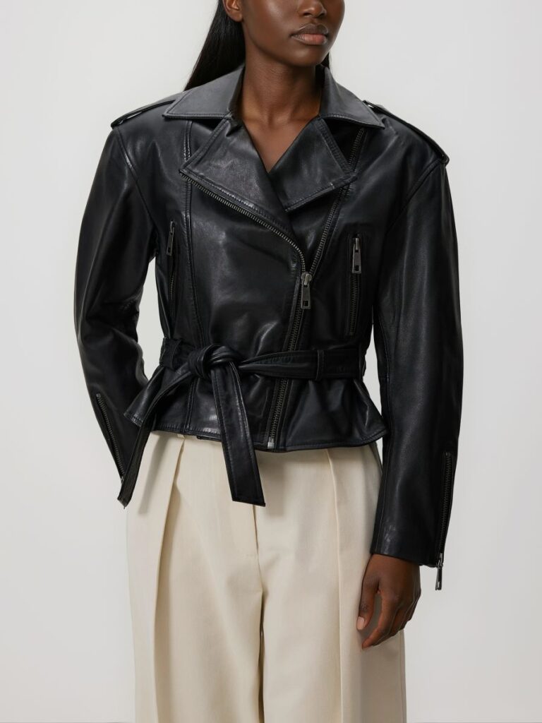 En skinnjacka i bikerstil ger mer kontrast. Den markerade formen bryter mot mjukare material och tillför en tydligare karaktär. Kombinationen av det strama och det mer följsamma skapar en balans som känns både genomtänkt och naturlig.